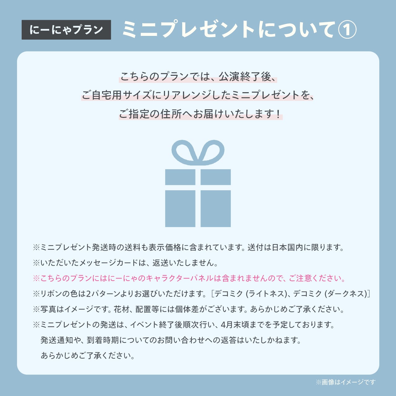 ※ミニプレゼントの発送は、イベント終了後順次行い、4月末頃までを予定しております。発送通知や、到着時期についてのお問い合わせへの返答はいたしかねます。あらかじめご了承ください。